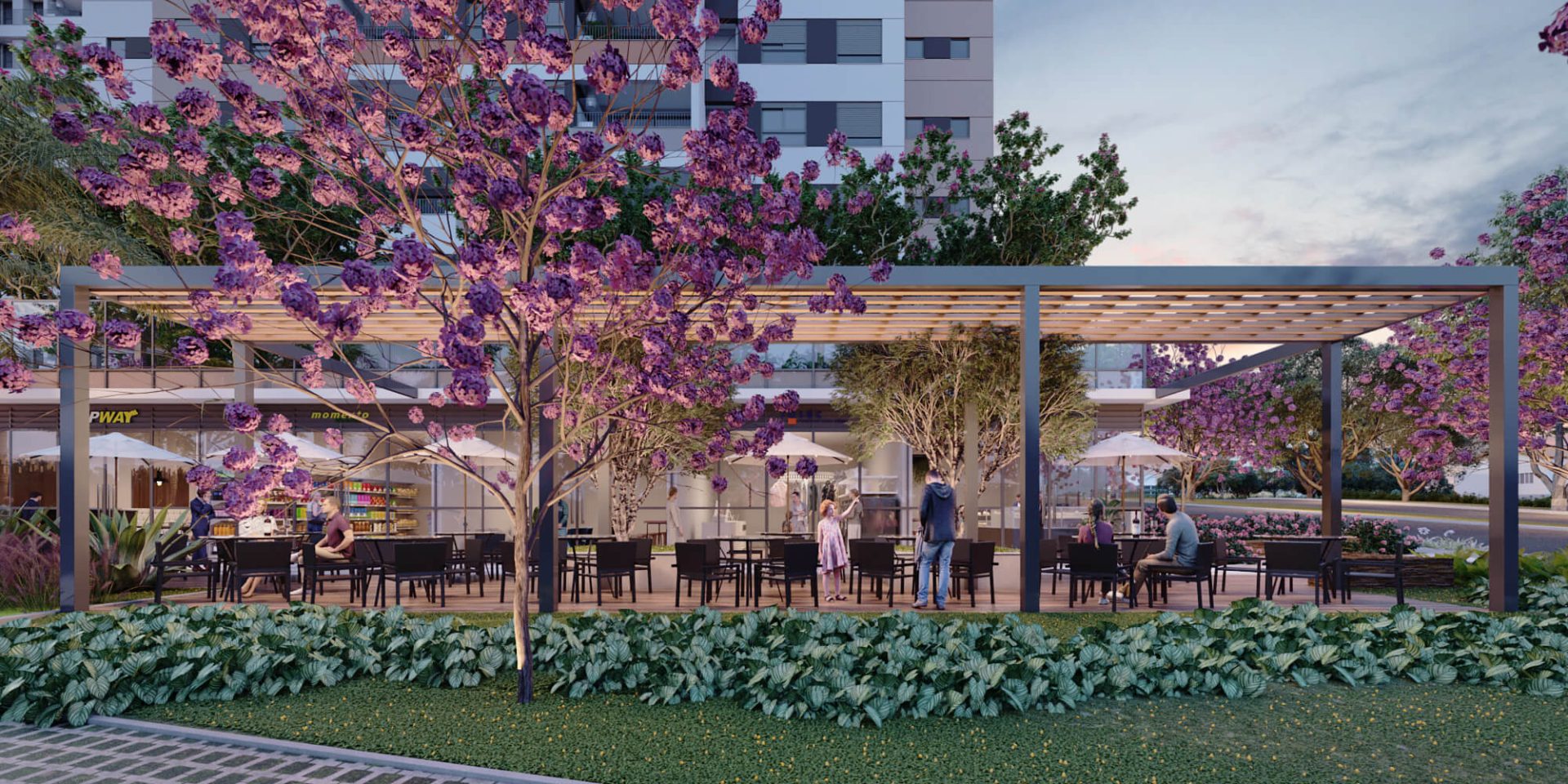 Pátio Boa Vista, localizado no Alto da Boa Vista, com lazer completo e Open market (infraestrutura para minimercado) com 6 lojas, praça com deck e mesas para convivência.