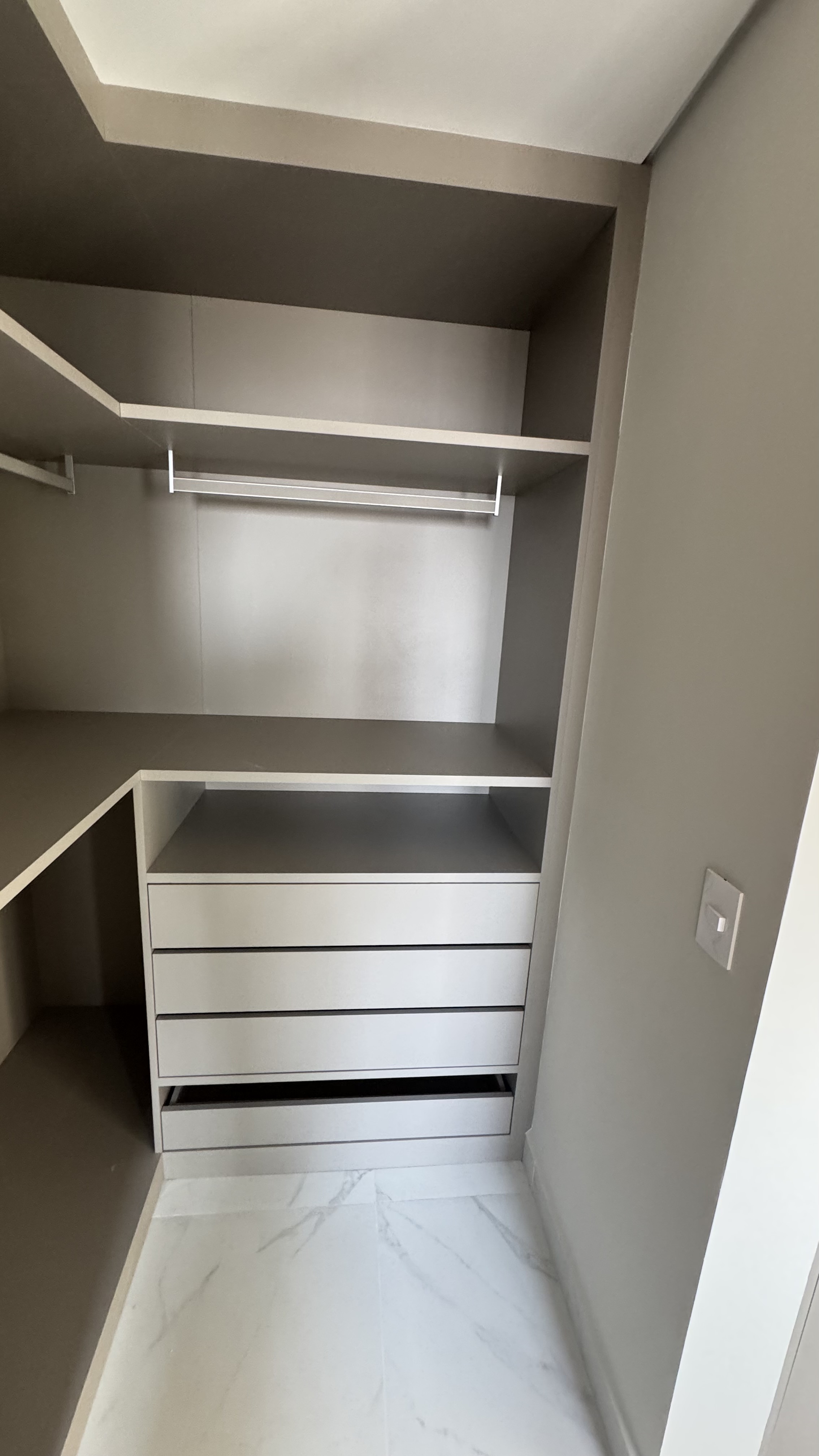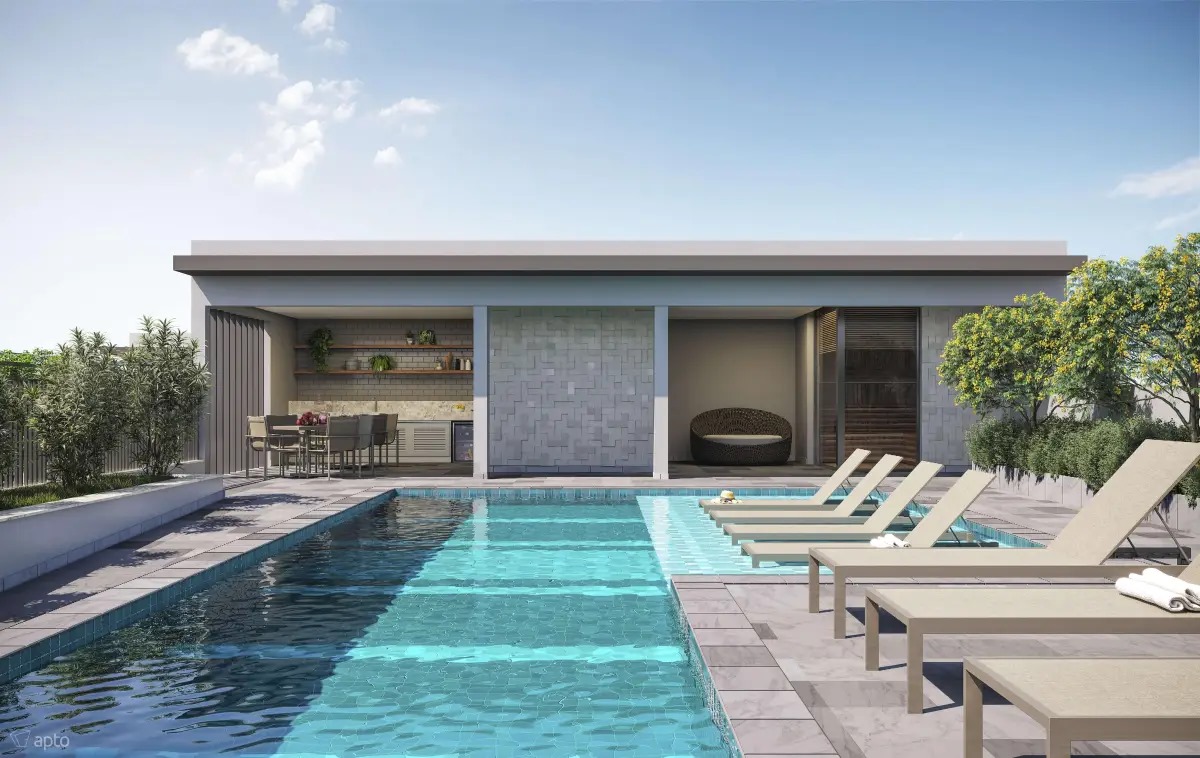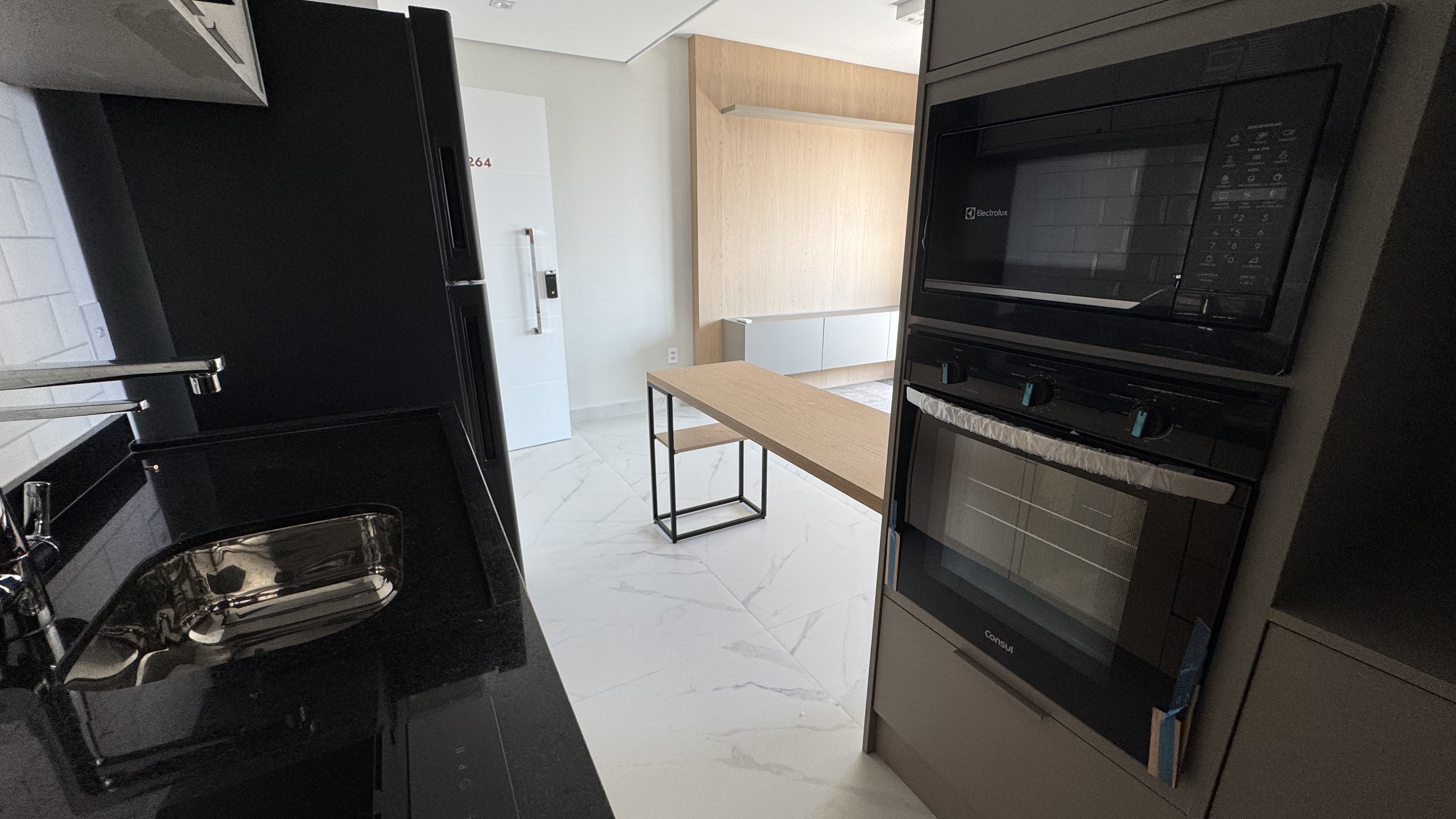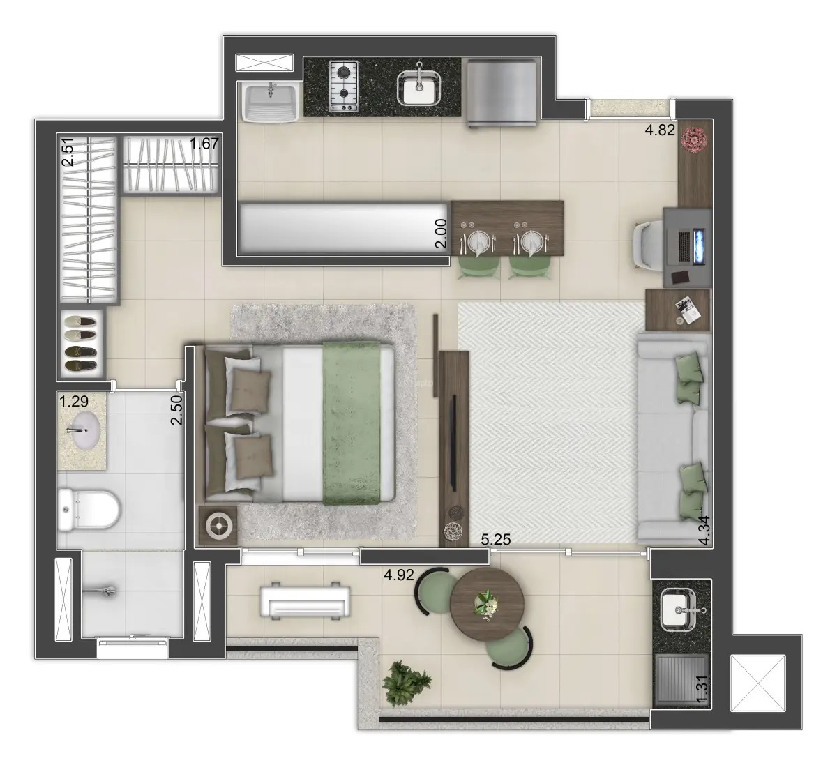 Apartamento Studio com área privativa de 44,00 m², mobiliado e decorado com móveis planejados, 1 suíte com closet, banheiro e lavatório, área de serviço, cozinha, sala de estar, varanda gourmet, fechadura biométrica e com senha na porta de entrada, persianas 100 % blackout e automatizada com controle remoto, 1 vaga de garagem por apartamento com ponto de recarga para carro elétrico, medição individual. Depósitos privativos no subsolo, sendo 1 depósito home box por apartamento com 2,75 m².